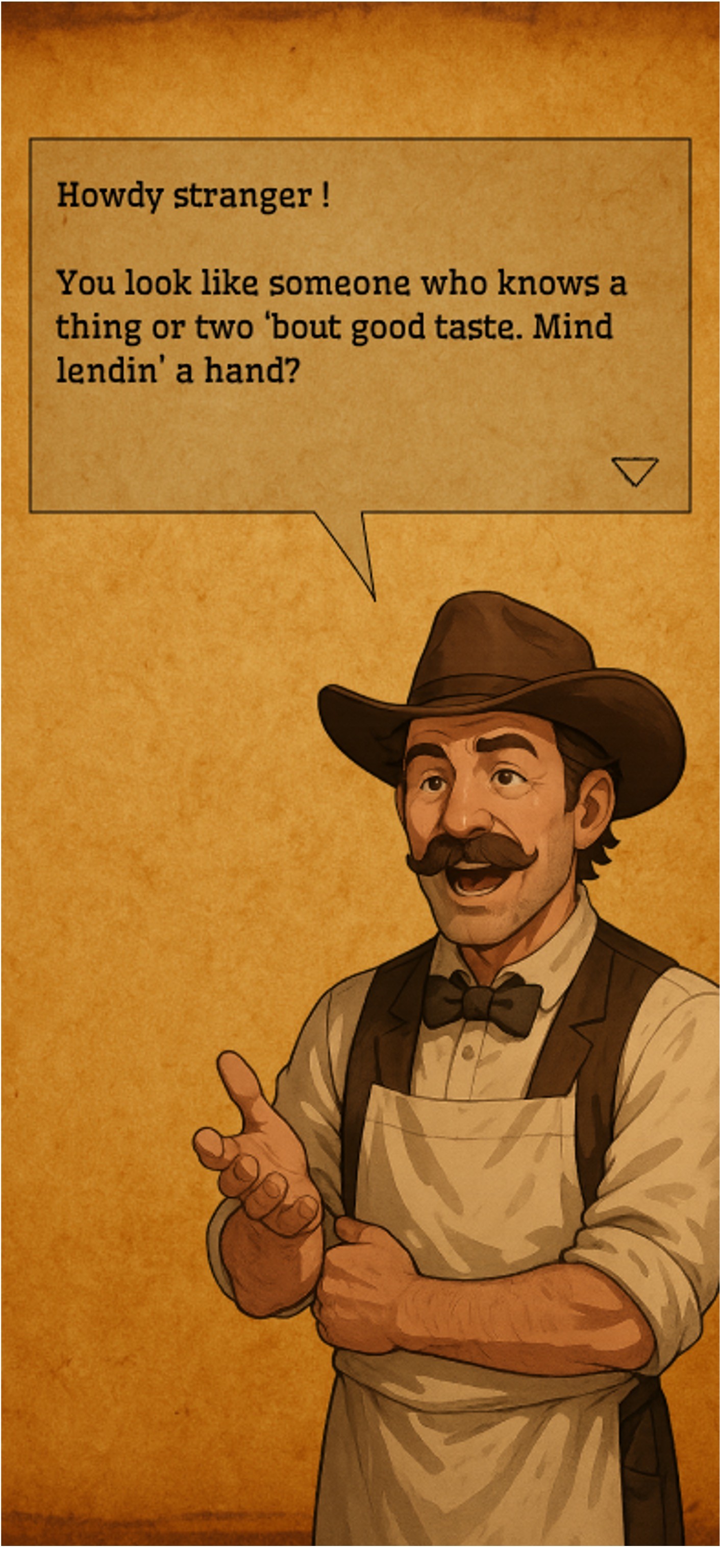 Visual Language: Parchment textures, western typography, and hand-drawn icons replace standard buttons.
